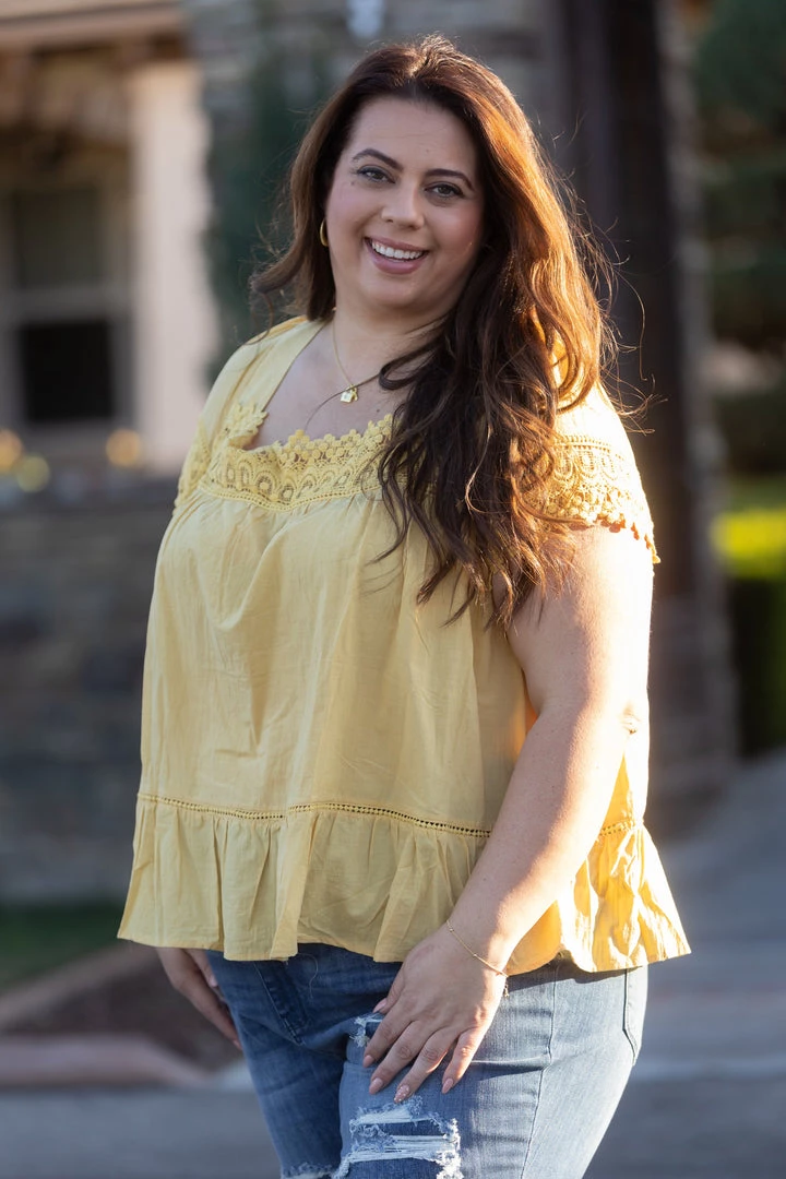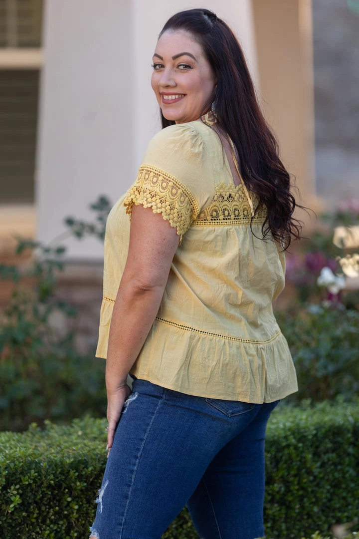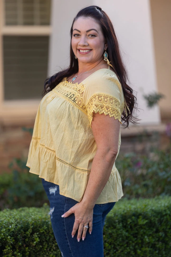 This stunning woven top is as sweet as honey! We are absolutely swooning over the lace details and open self tie back. With a relaxed fit, this top features a square neckline with lace trim, short sleeves…also with lace trim and ruffled hem.