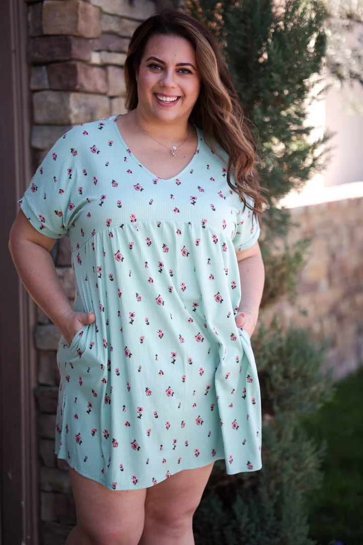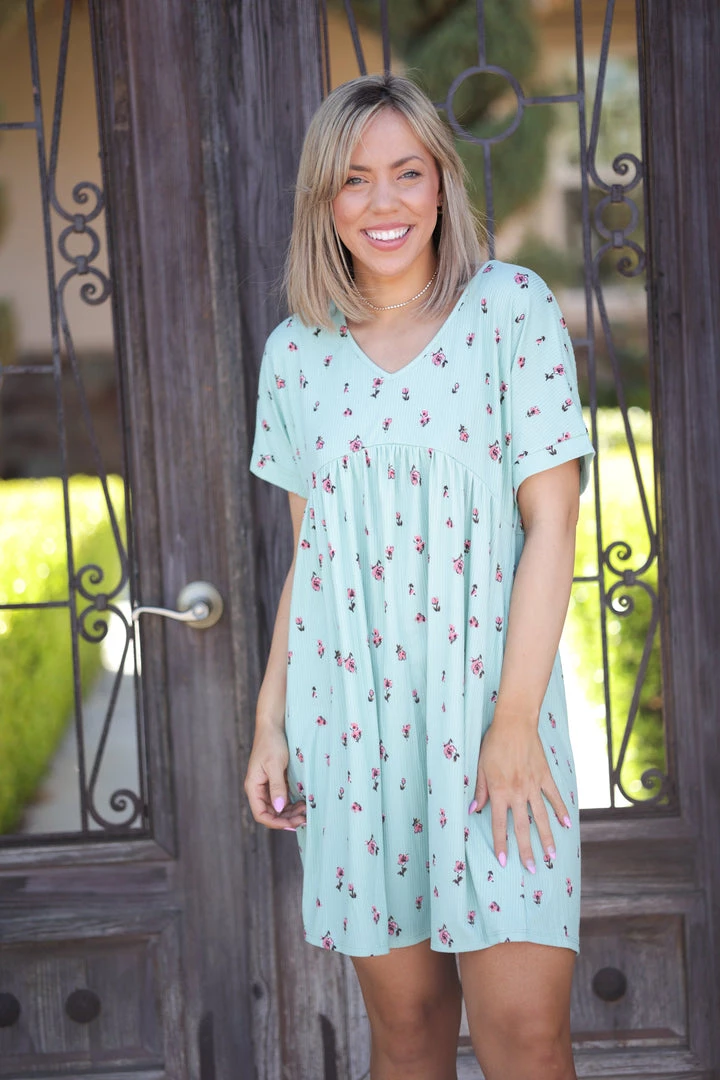 The sweet simplicity of those little flowers on this mint dress is as close to perfect as it gets. With a relaxed fit, this dress features a v-neck, short dolman sleeves, empire waist and side pockets!