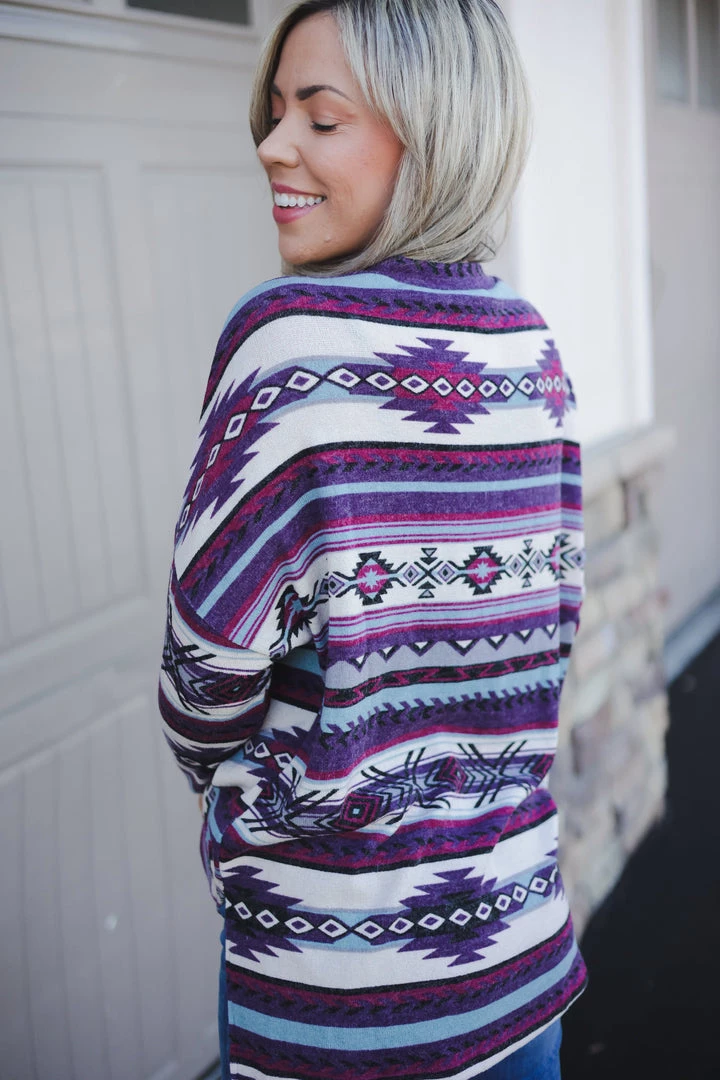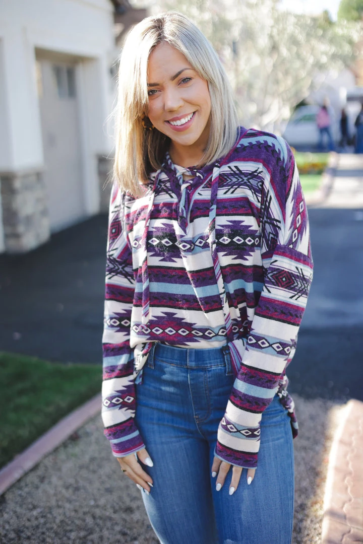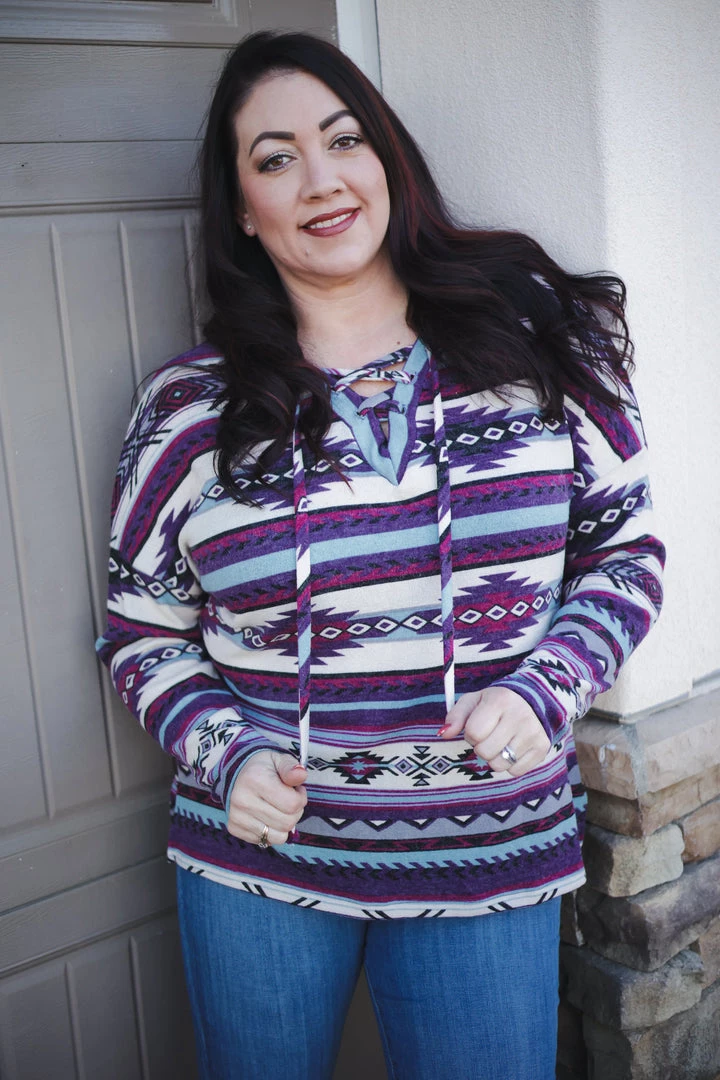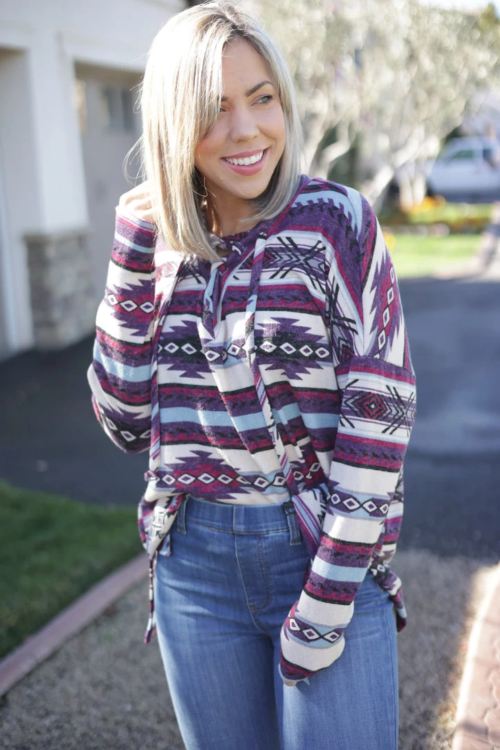 Bring out your inner Yellowstone with this amazing aztec print long sleeve pullover. With a relaxed fit, this top features a v-neck with adjustable drawstrings and a hi lo hem.