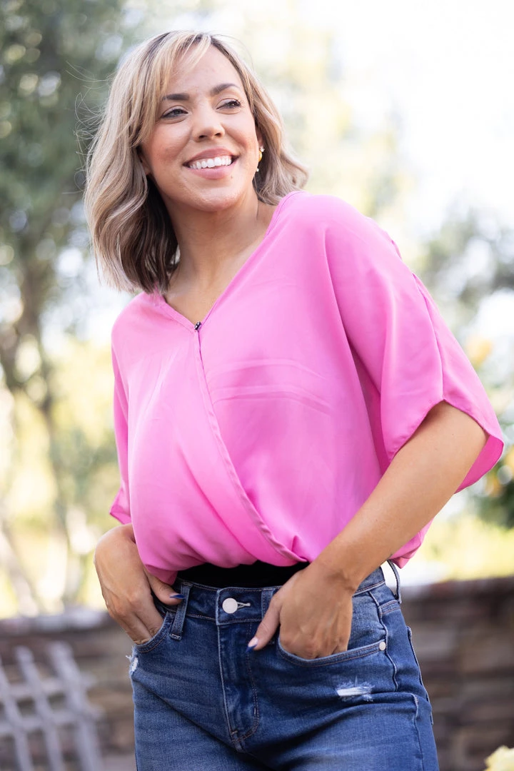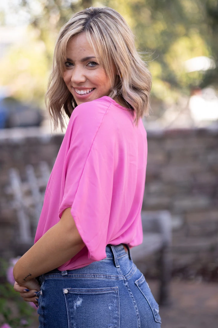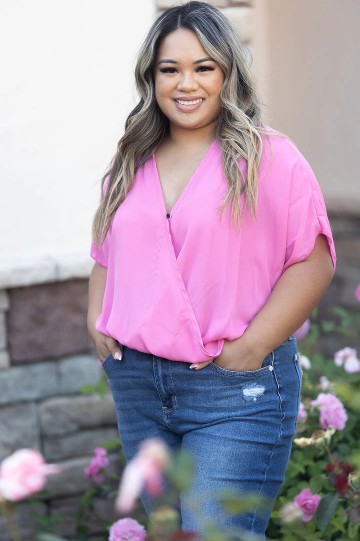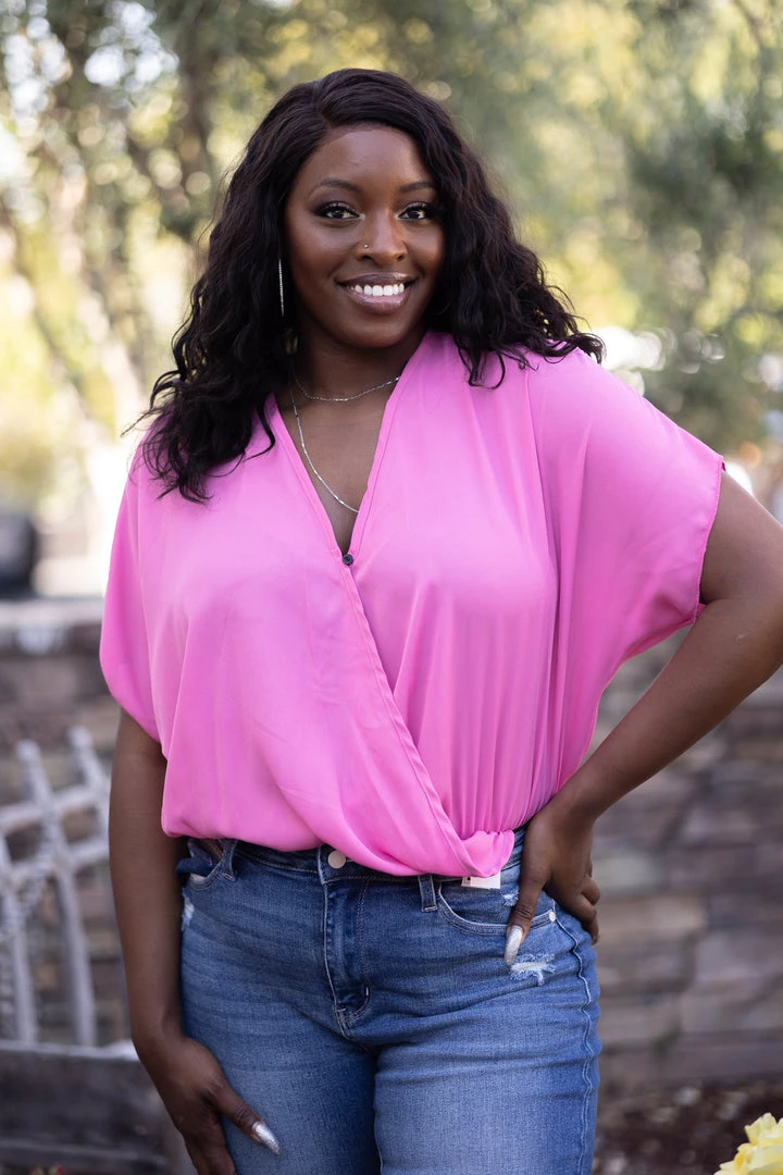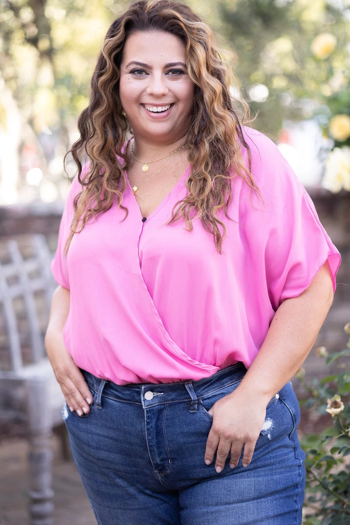 This bodysuit gives the perfect tuck you’ve been looking for in a top. No longer will you ever have to worry about your top not being even all the way around. We are loving the flowy fit and lightweight fabric. This body suit does feature functional snaps for easy in and out, a V-neck with adjustable button and short sleeves.