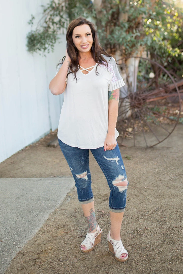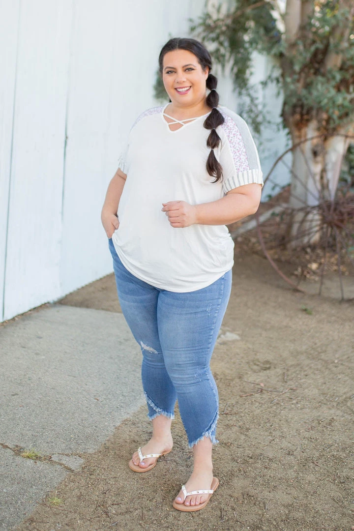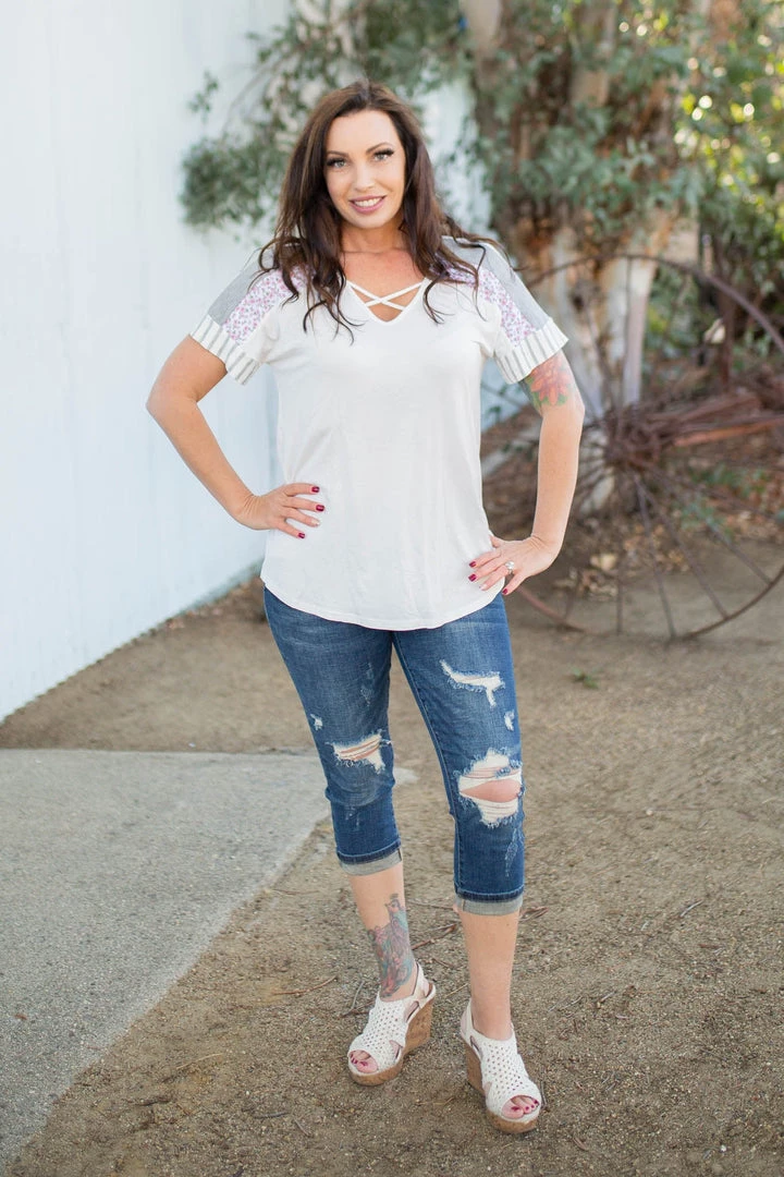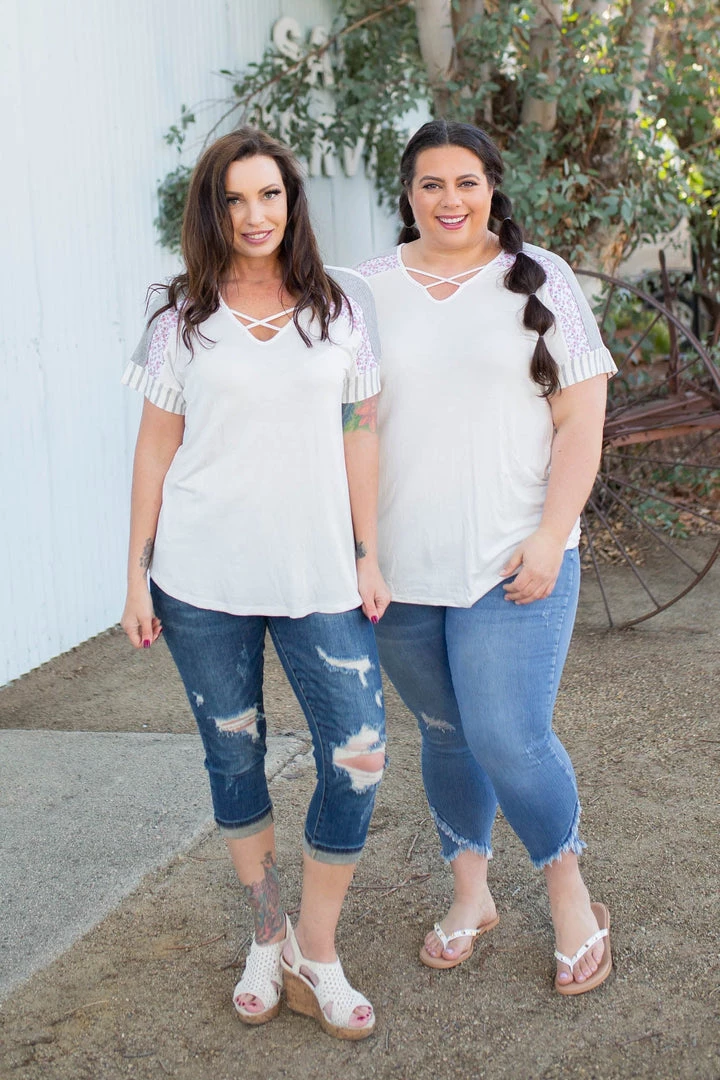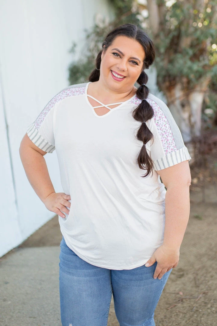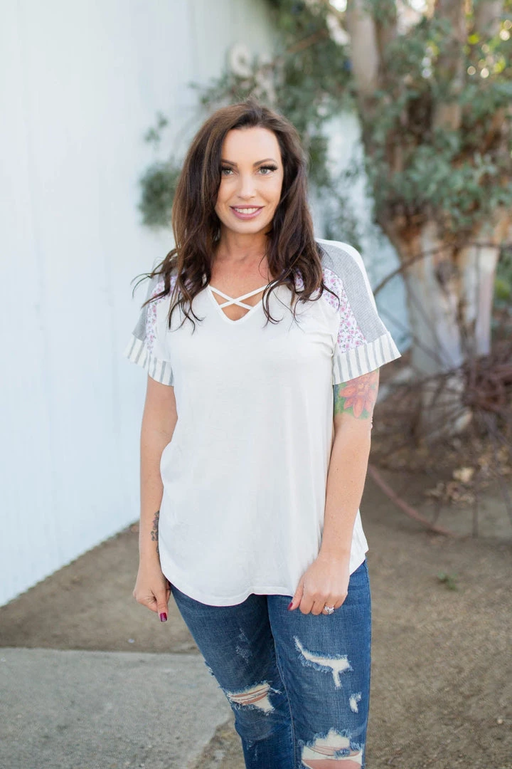 This short sleeve top is sure to be the best top you’ll own that will carry your right into Spring with. With a relaxed fit, this top features a v-neck with criss cross details, short sleeves with the most amazing stripe and floral contrasts  and a rounded hem.Â