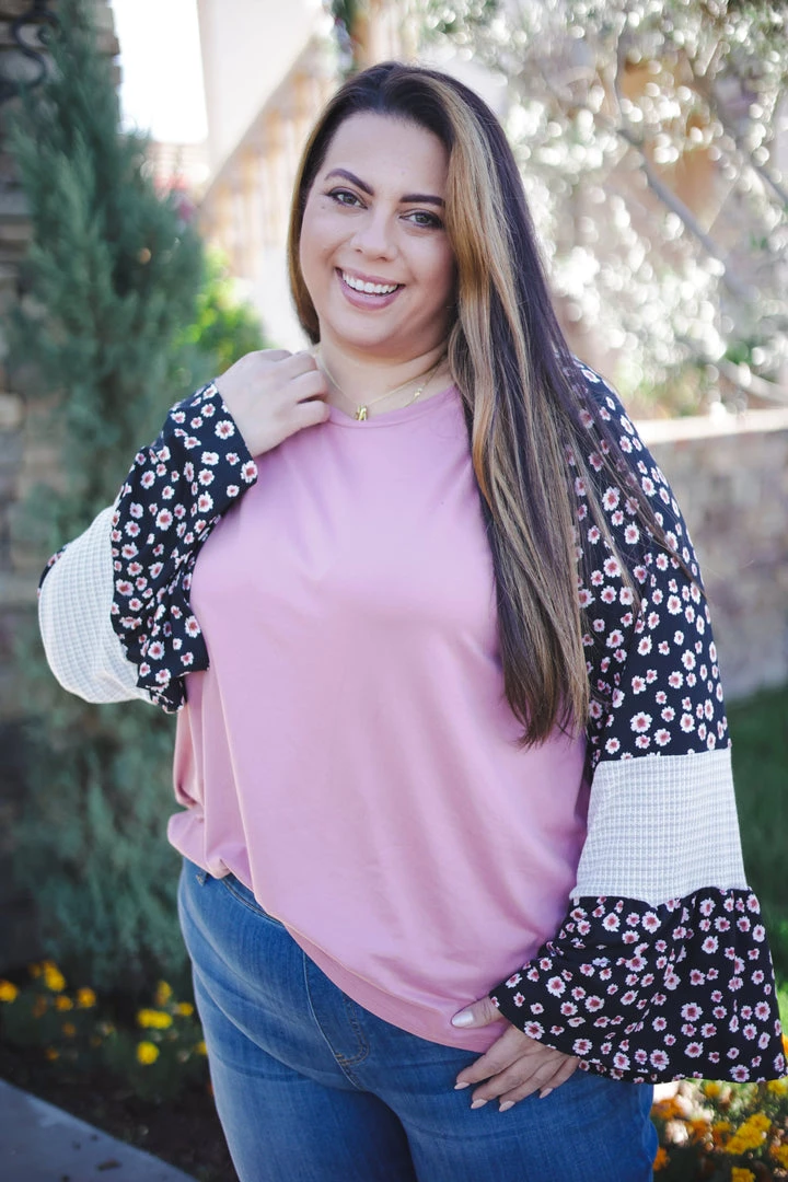 You will cherish this buttery soft bell sleeve with all you have. We are especially in love with those jacquard color block sleeves! With a relaxed fit, this top features a round neckline, long bell sleeves and rounded hem.
