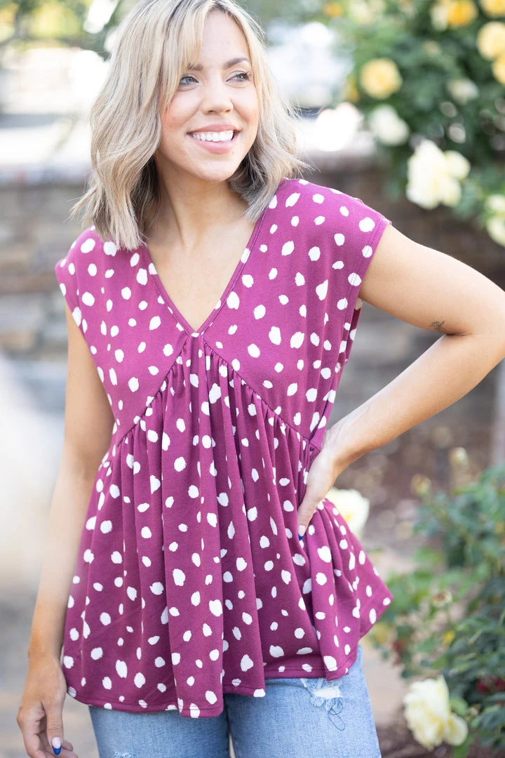 This ultra soft spotted babydoll is the perfect addition to your wardrobe. Made from the softest oakley fabric, this top features a relaxed fit, drop shoulder short cap sleeves and v-neck.