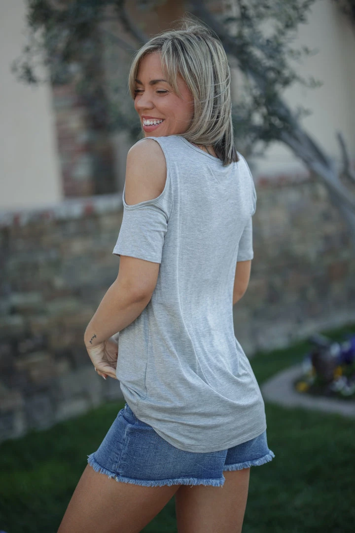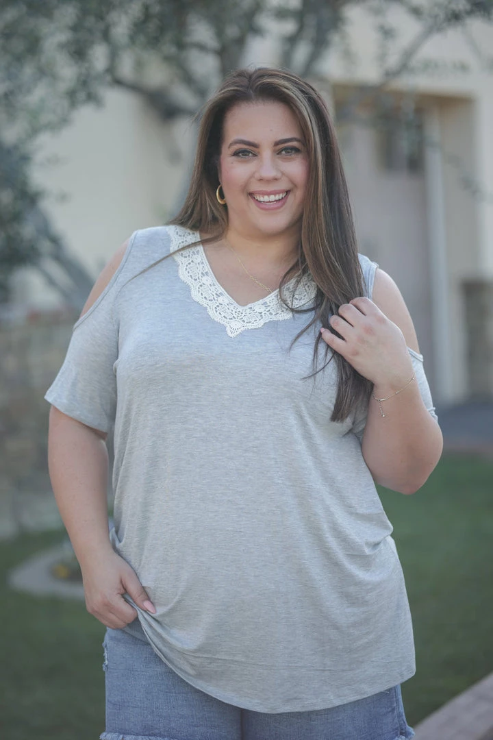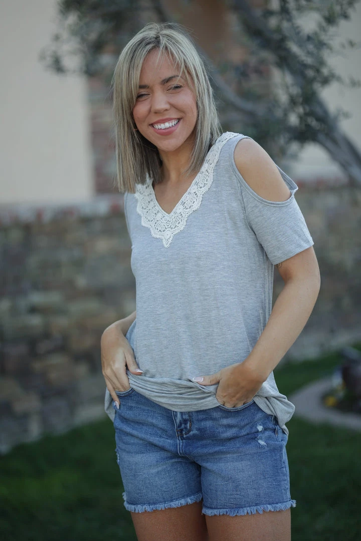 This exquisite lacy cold shoulder is the perfect piece for any occasion, it’s so easy to dress up or down! With a relaxed fit, this top features a v-neck with lace trim, short sleeves with cold shoulder cut outs and a rounded hem.