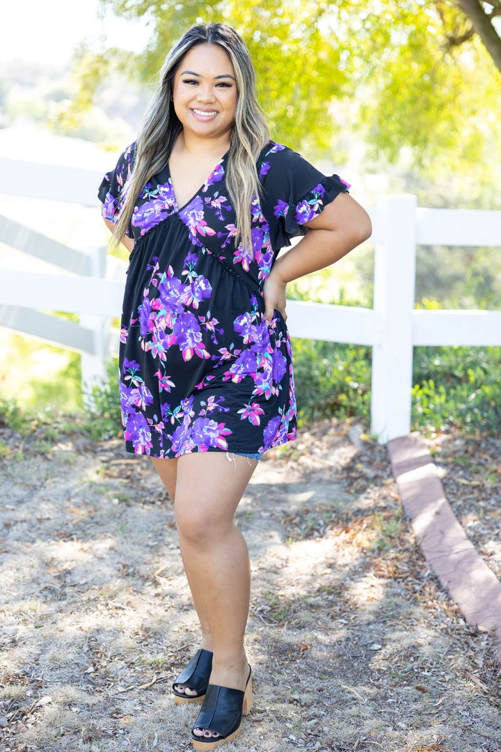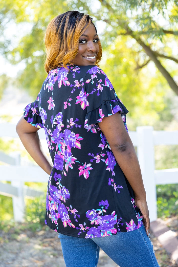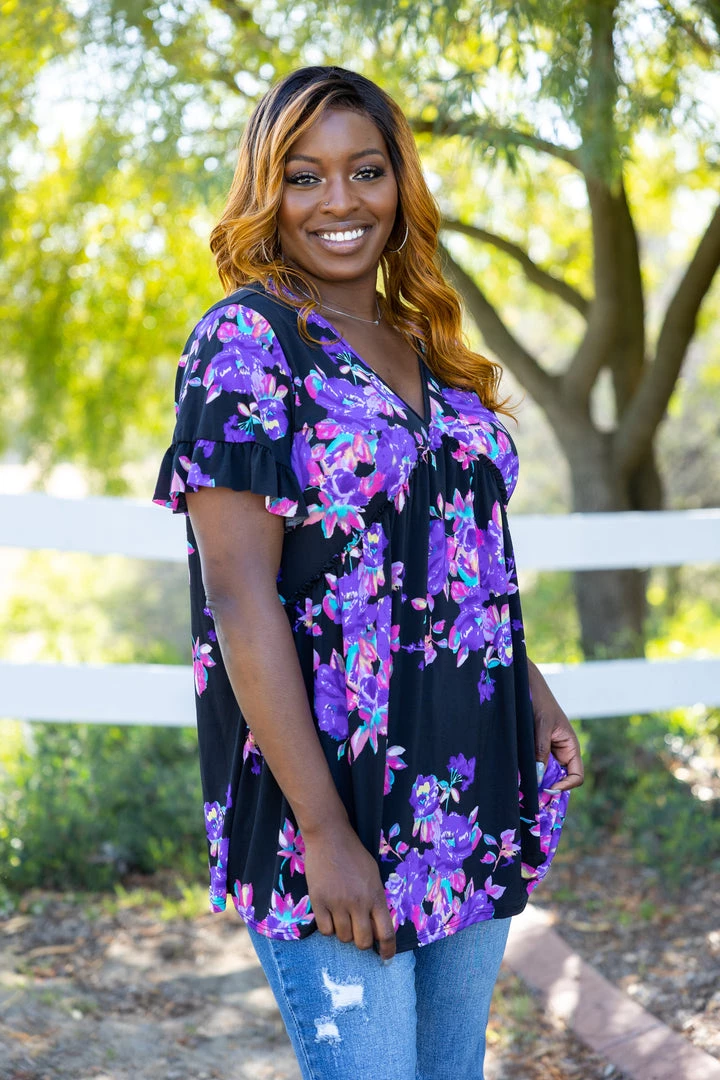 We are swooning over this vibrant purple and pink floral babydoll. Made from amazing bulgari fabric, this top features a v-neck, short ruffled sleeves and a ruffled empire waistline.
