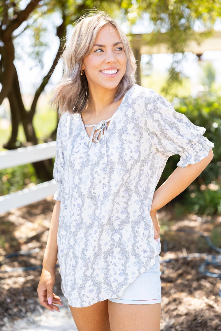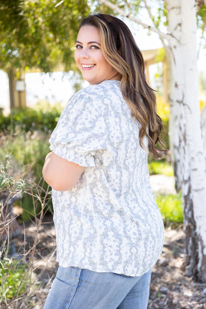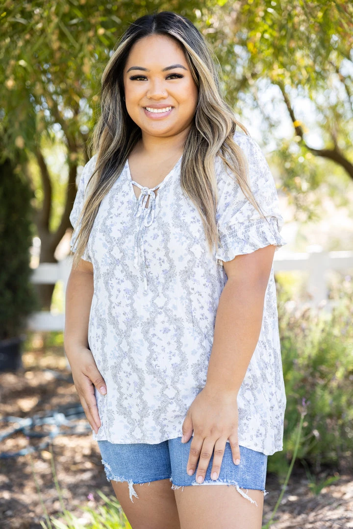 Everything about this top leads us to it, and makes it a must have to take home. From the light weight fabric, to the fit, we are swooning! With a relaxed fit, this top features short ruffled sleeves, a v-neck with self tie detail and rounded hem.