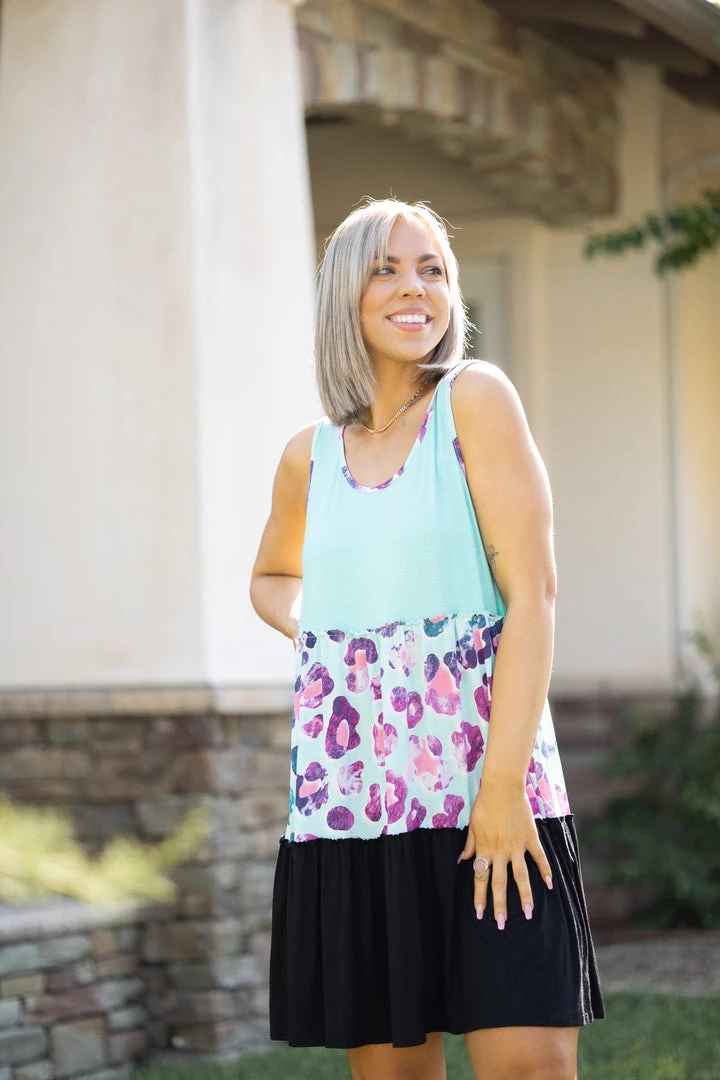 This gorgeous color block dress is not only comfortable, but it’s absolutely effortless. With a relaxed A-line fit, this sleeveless dress features a scoop, side pockets and tiered ruffled hem.Â