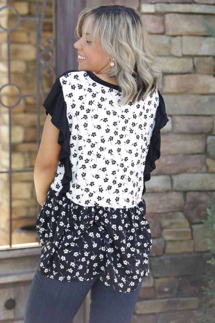 You will instantly become obsessively devoted to this black and white ruffled short sleeve top. Made from buttery soft baby suede, this top features, wide ruffled short sleeves, and rounded hem.