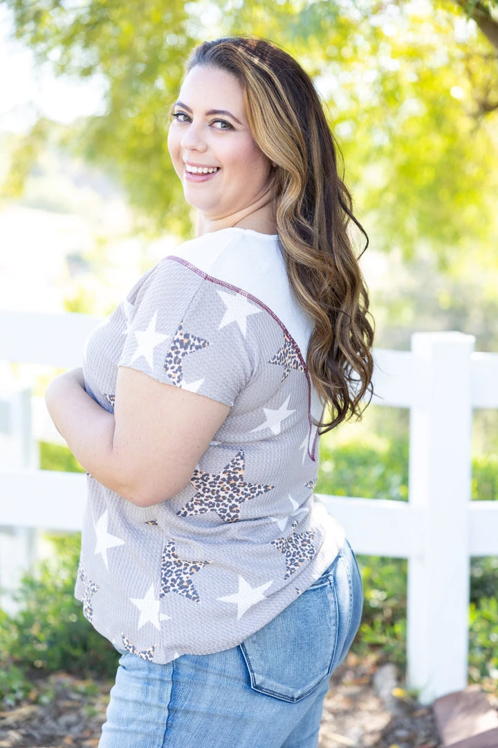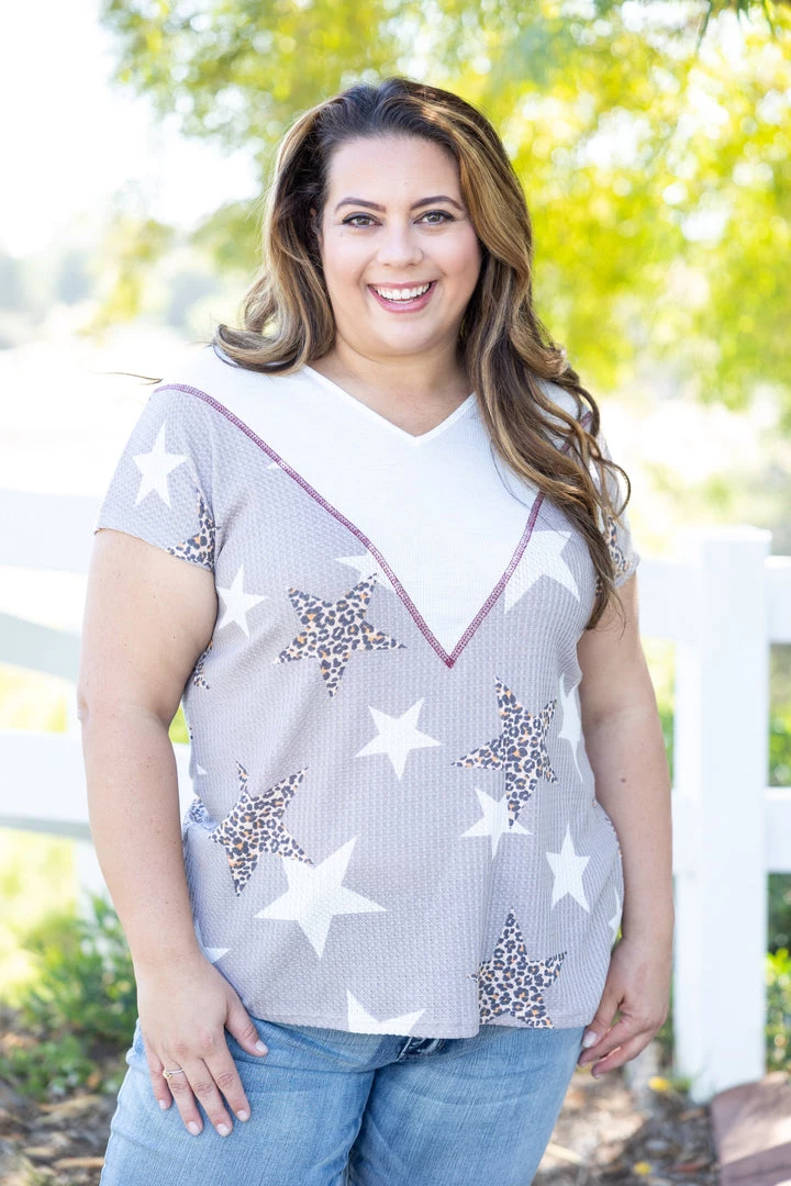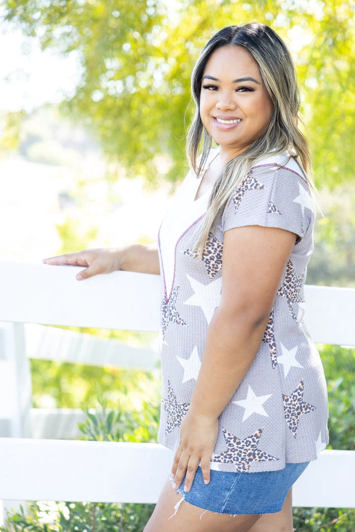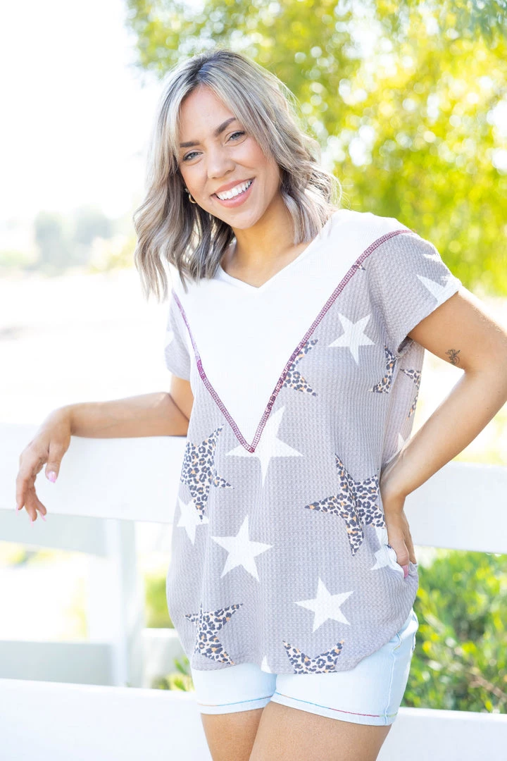 This short sleeve dolman was sent right from the heavens above! With a relaxed fit this top features short dolman sleeves, cheveron colorblocking with reverse stitching details and rounded hem.