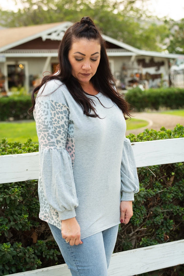 Every grey cloud has a silver lining and this long sleeve top brings so much joy to us with the rainbow printed contrasting animal print on this solid grey base. Featuring a scoop round neck, balloon sleeves and relaxed fit.