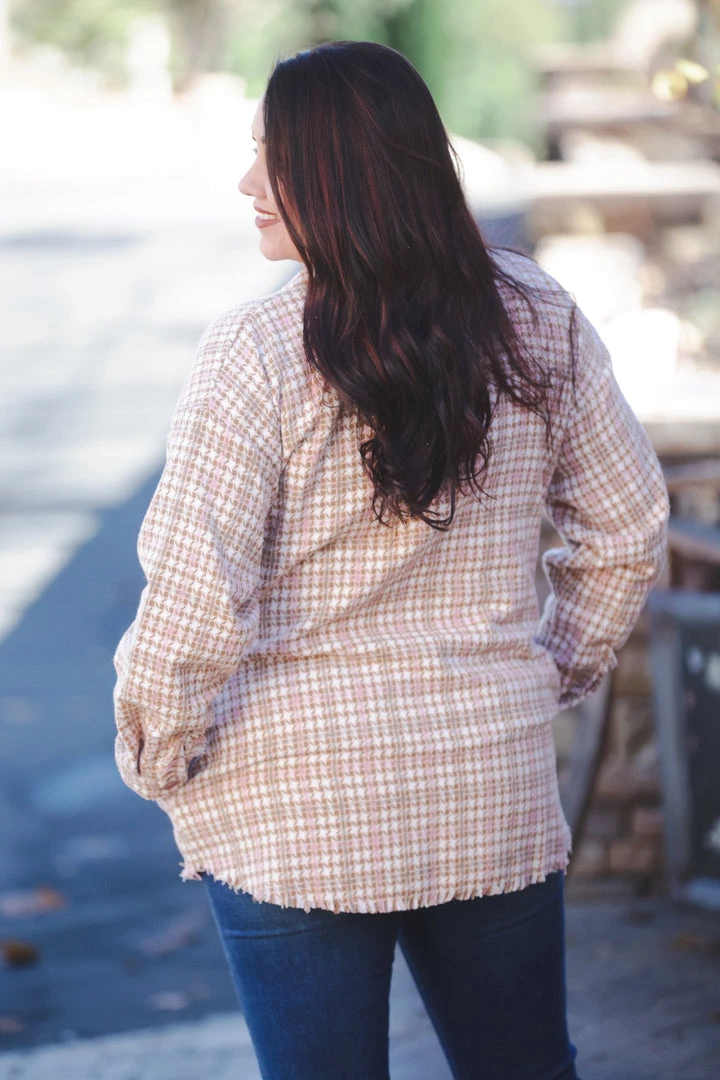 OMG this jacket is THE perfect transitional jacket. The pink and taupe colorway will allow you to seamlessly spring into Spring in style! With a relaxed fit, this jacket features a rounded raw hem, button enclosure and front utility pockets.