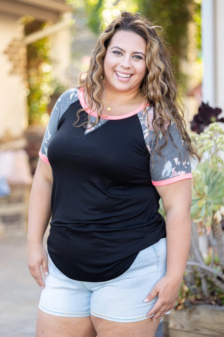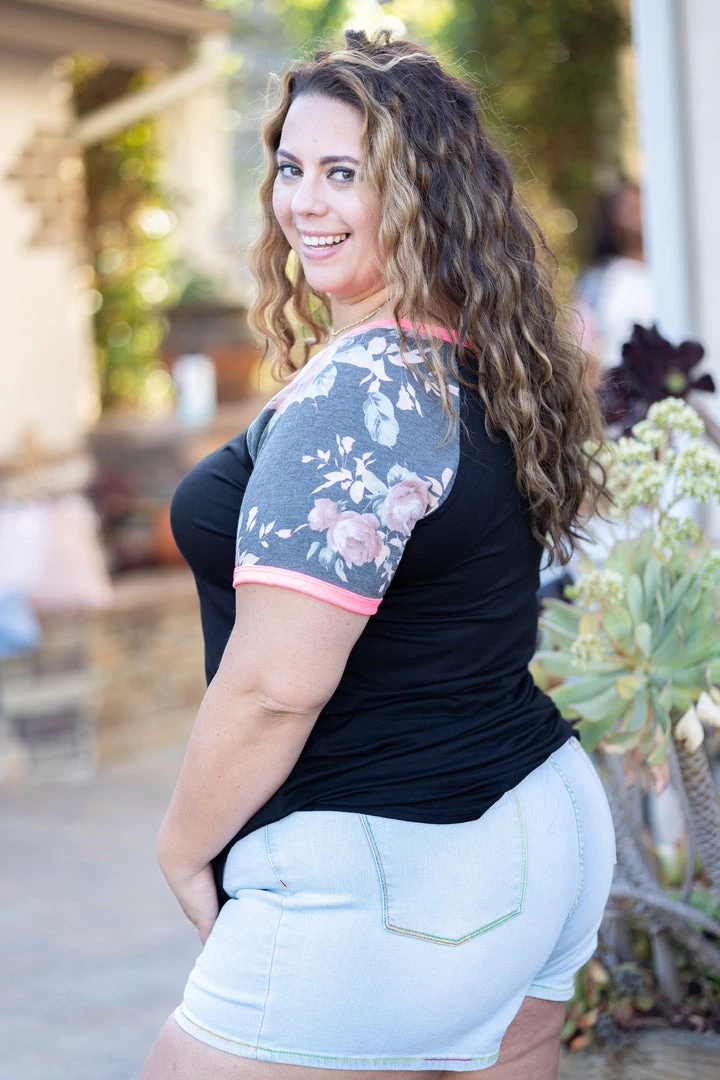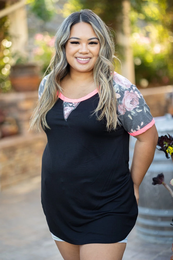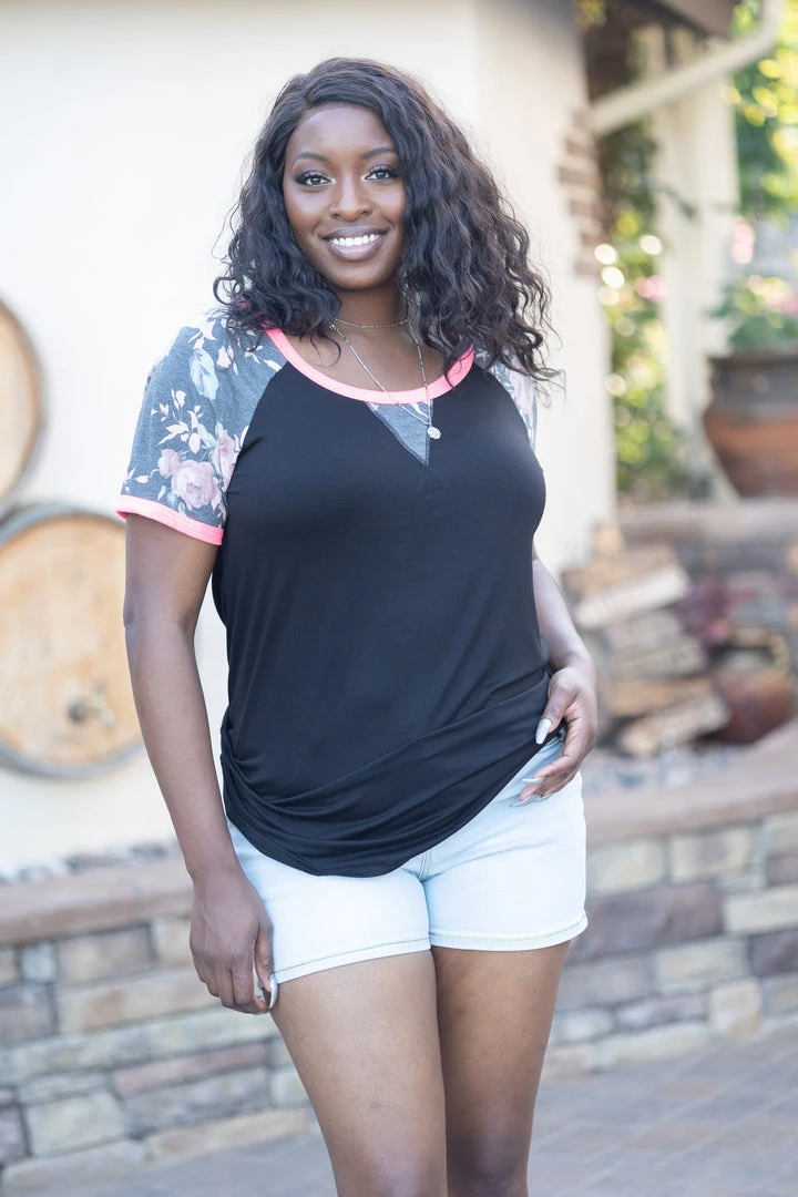 This short sleeve raglan has just the right amount of everything! Floral, solid and neon! With a relaxed fit, this top features a round neckline with neon trim, reverse stitching details and rounded hem.