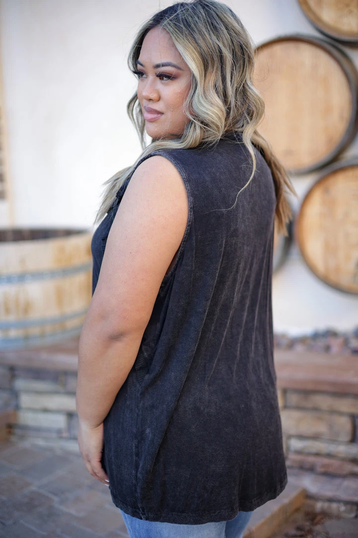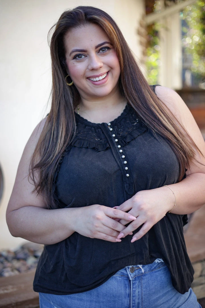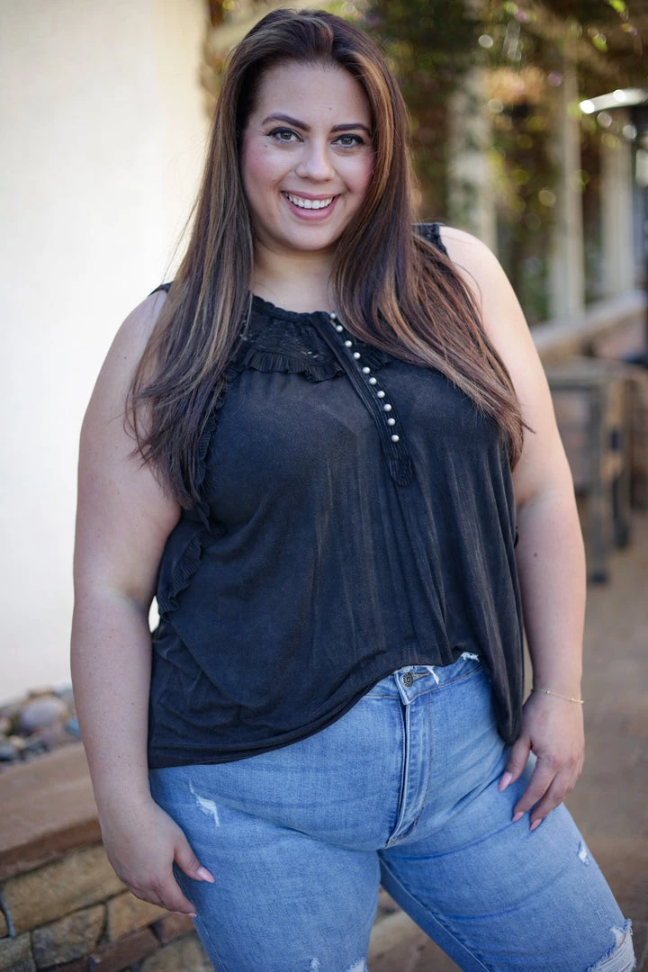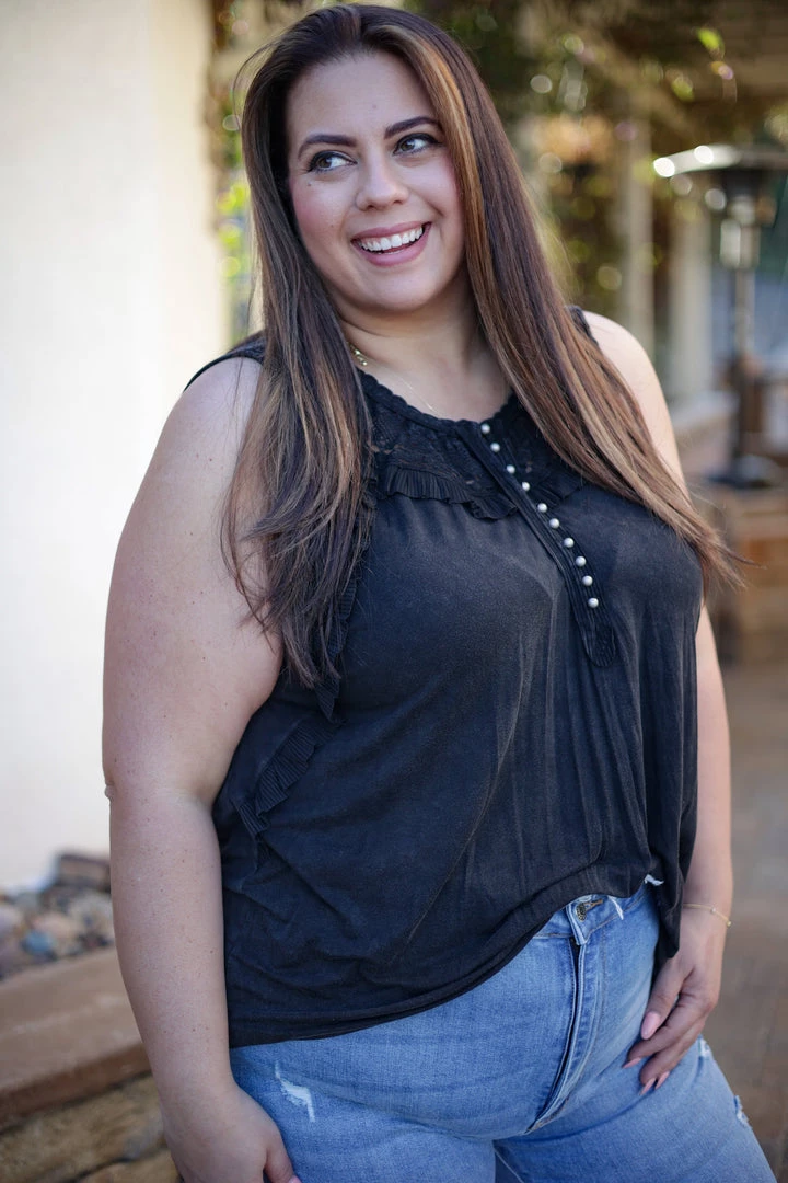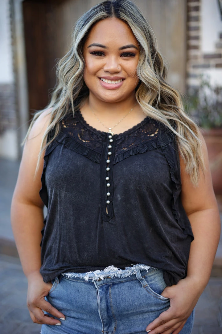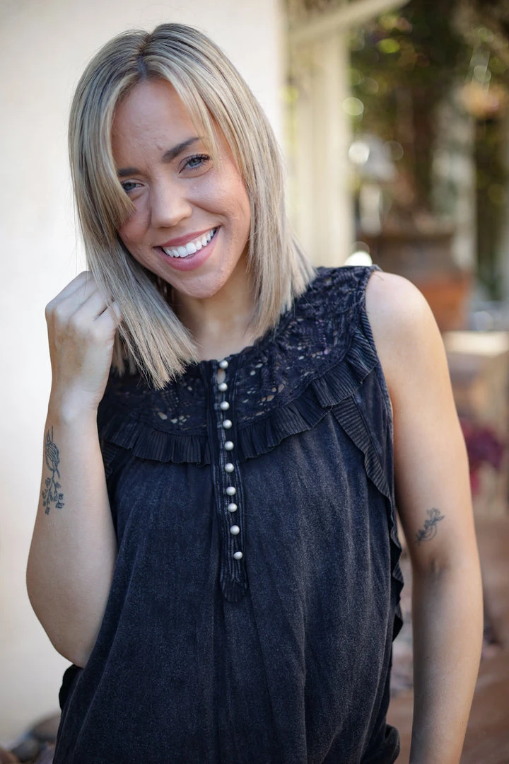 Made from the highest quality material with impeccable construction, this mineral washed sleeveless top is sure to become you absolute favorite. With a relaxed fit, this top features a round neckline with lace and ruffle detail, functioning pewter buttons and a rounded hem.