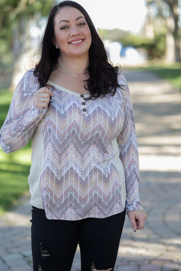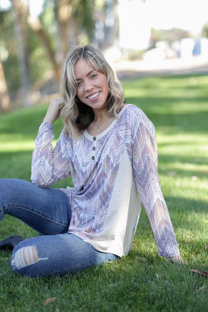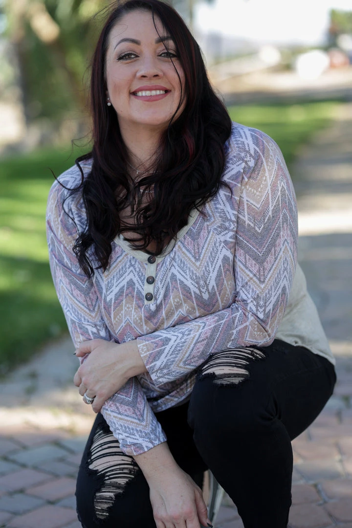 This amazing loose fitting henley is has the perfect neutral color scheme to it. Made from the softest jersey fabric, this top features a scoop neck with button detail, long sleeves and a rounded hem. Â