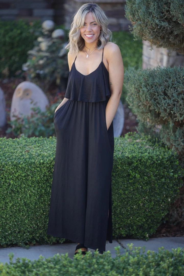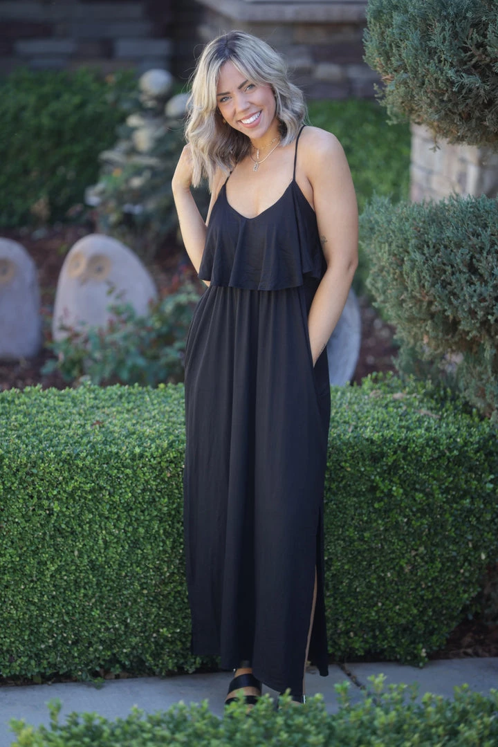 Let your beauty unleash in this effortless, classy and comfortable maxi dress. Made from the softest jersey material, this maxi features side slits, a ruffled tiered bodice, criss cross back detail and pockets!