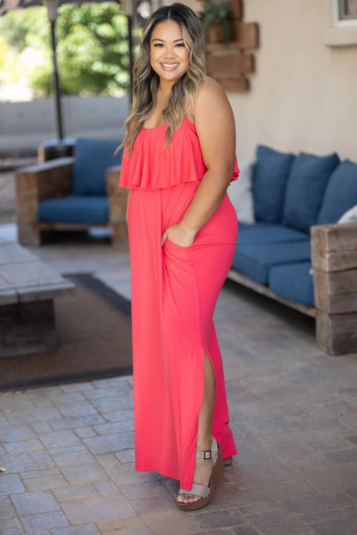 Let your beauty unleash in this effortless, classy and comfortable maxi dress. Made from the softest jersey material, this maxi features side slits, a ruffled tiered bodice, crisscross back detail and pockets!  Â