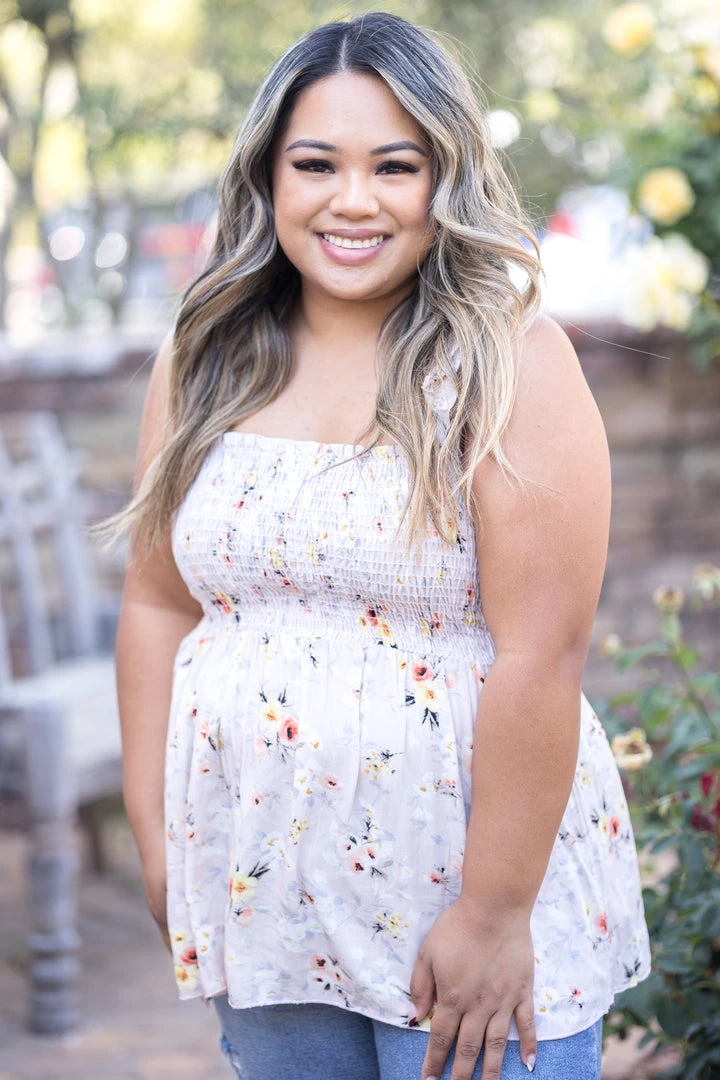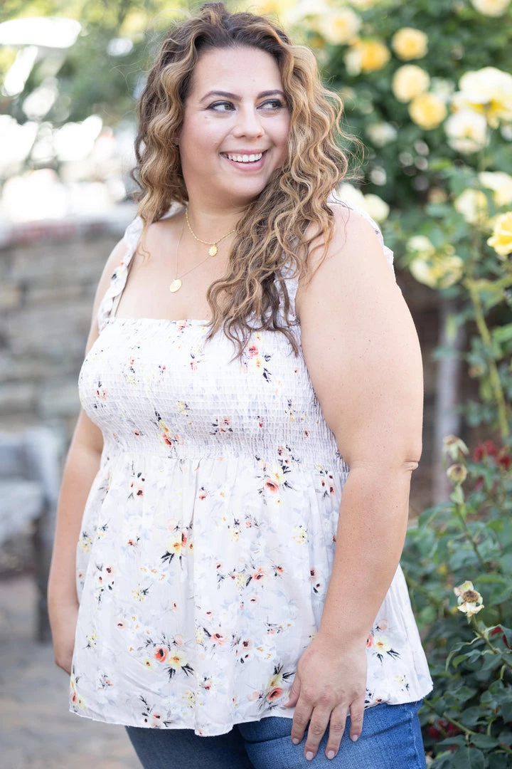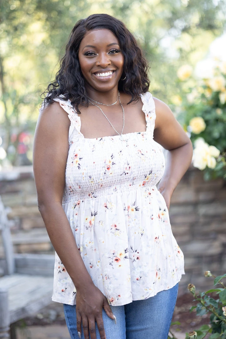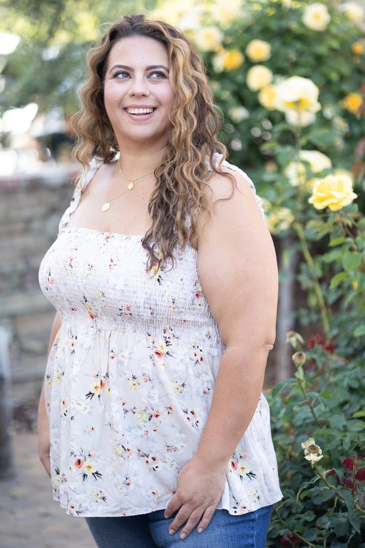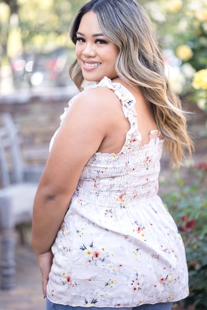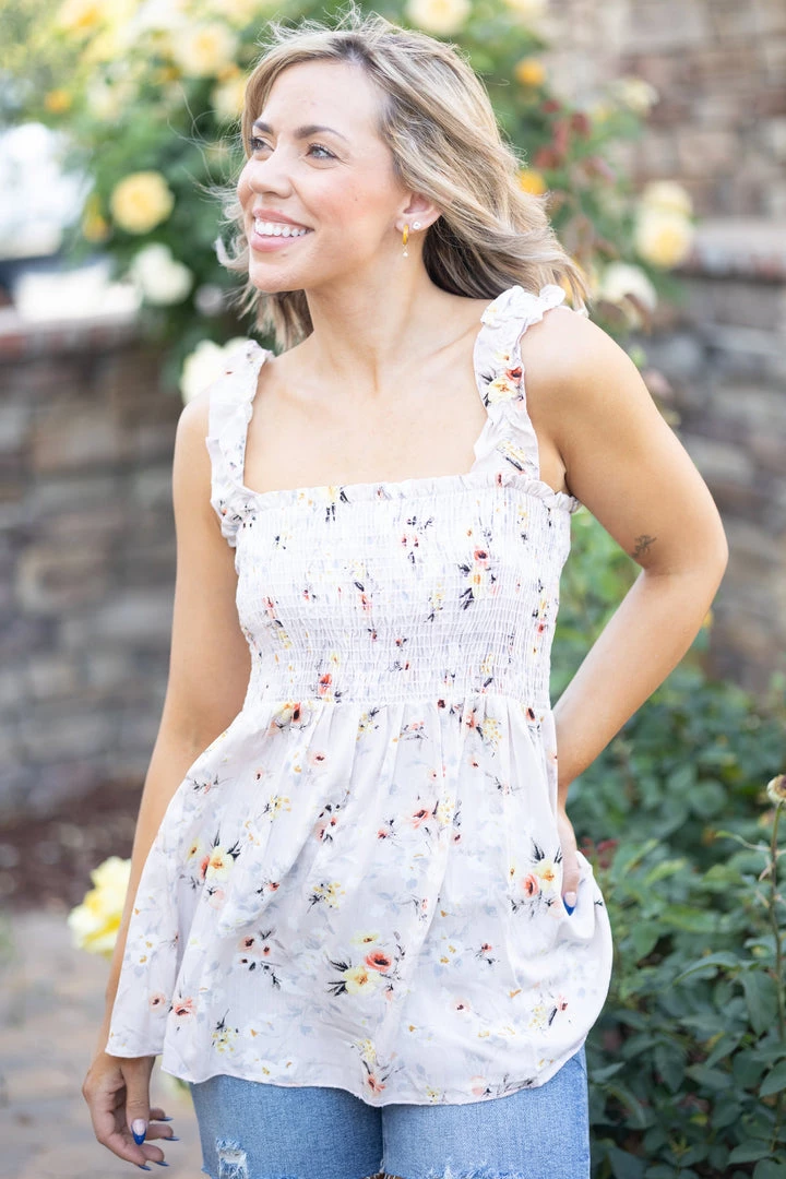 This amazingly soft sleeveless top is delightfully dainty with the gorgeous floral print and amazing style. This top features a square neckline with smocked bodice and ruffled straps. Â
