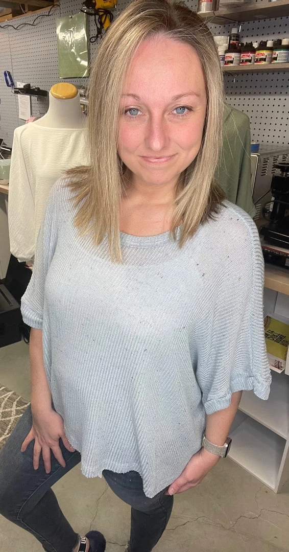 Soft and lightweight light blue spring sweater with a fun speckled texture.