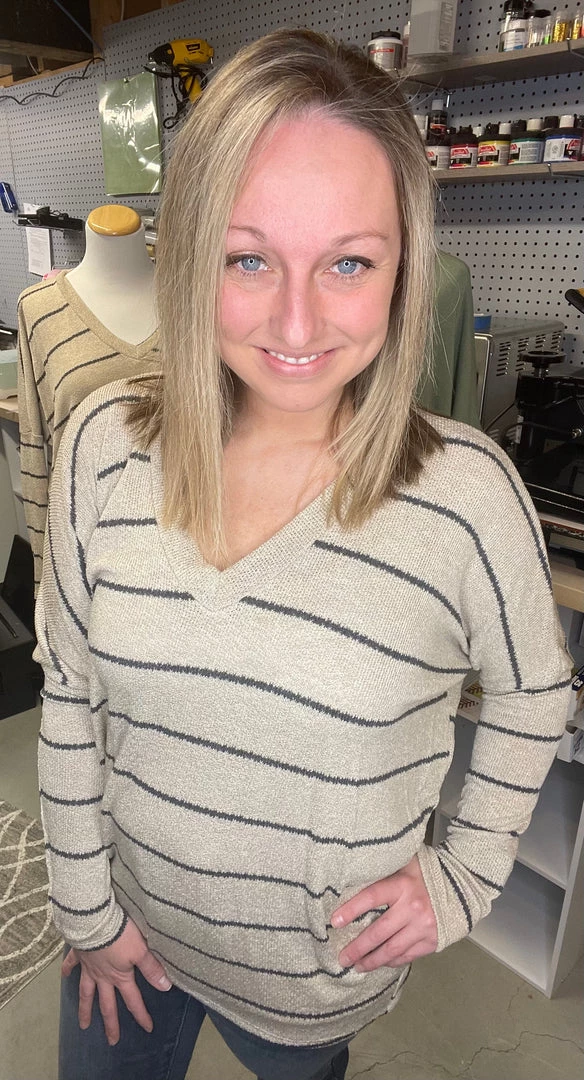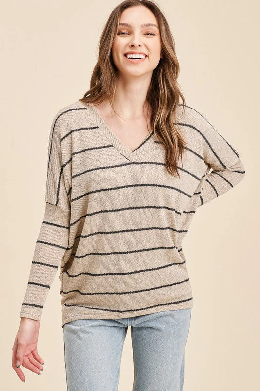 Soft and lightweight v-neck sweater with wide stripe and dolman sleeve. This one will look so cute with jeans or shorts this season!