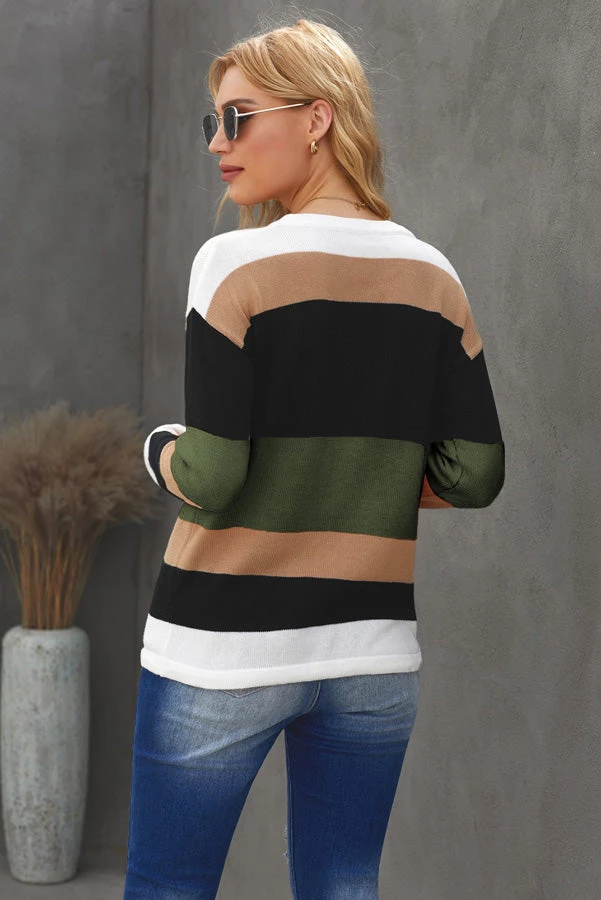 Lightweight knit sweater with colorblock design and a drawstring waist detail.