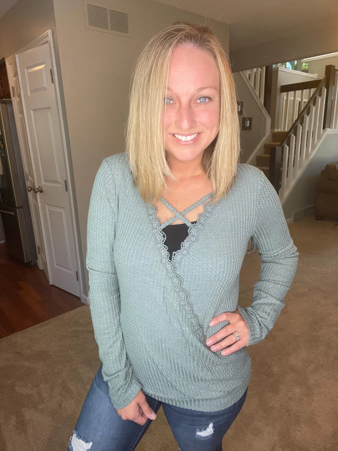 Soft waffle material this sweater offers a cross over design for a flattering coverage along with a lace v-neck cage detail.