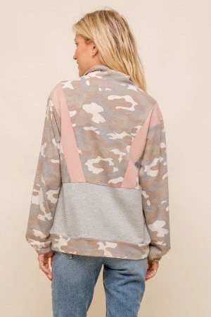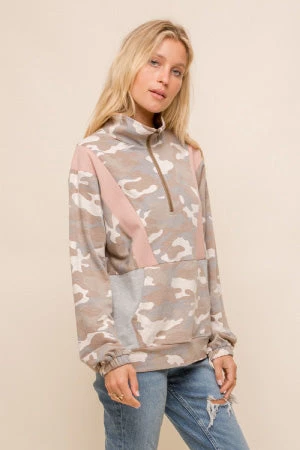 Camouflaged colorblock pull over with half zip pull over.