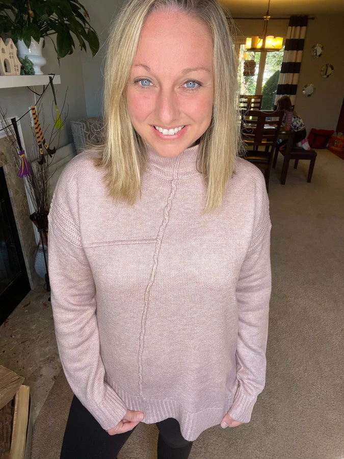 Uneven hem Mock Neck sweater with knit contrast detail, one side slit and a unique exposed seam.