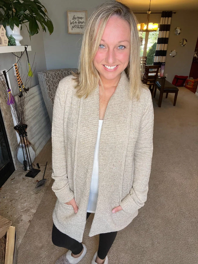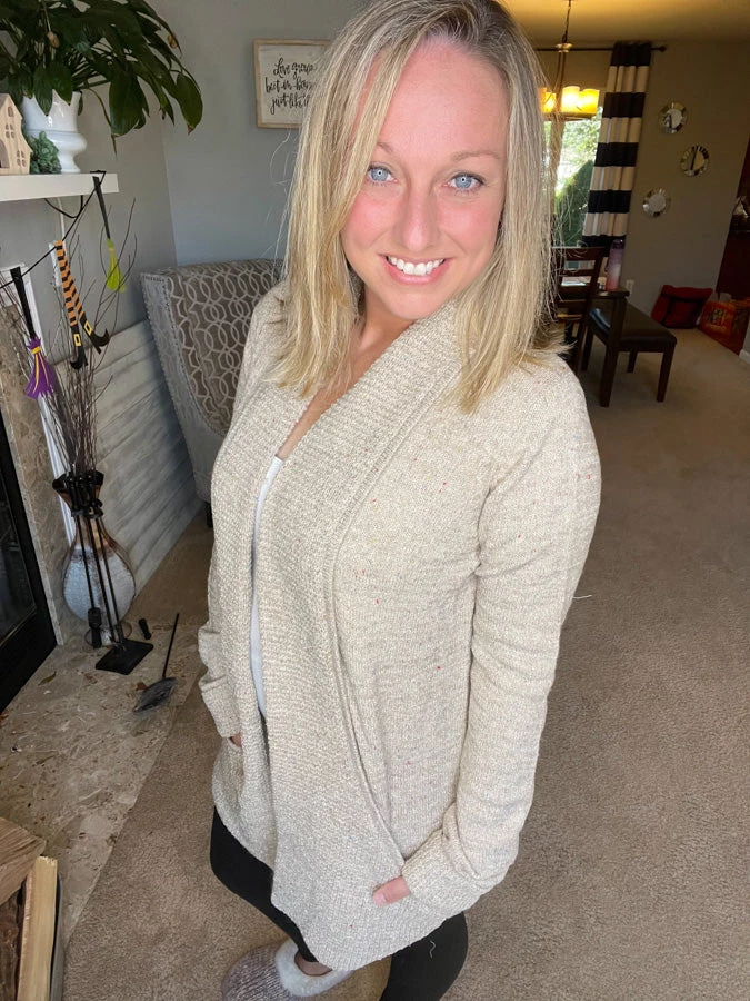Speckled knit cardigan with a shawl collar detail and pockets.Â