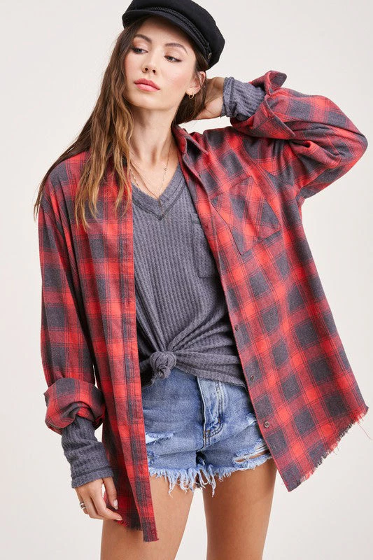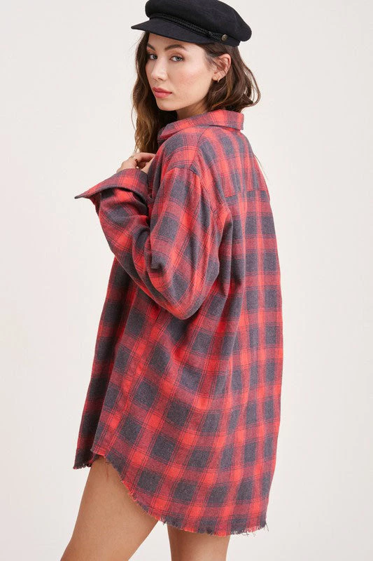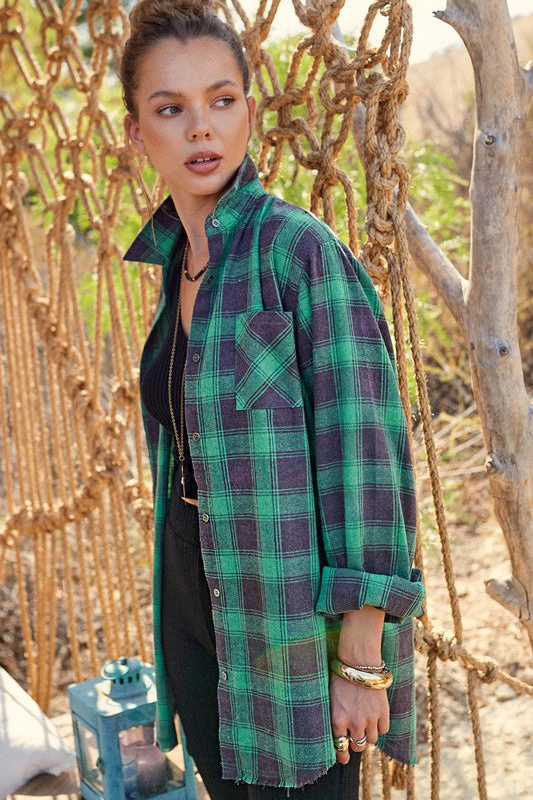 Be cute & casual in this vintage washed plaid shirt! Longline length for extra coverage and features a collared V-neck, relaxed bodice, and long sleeves with buttoning cuffs and raw-cut hem. It’s the perfect pick for a cute and casual look.