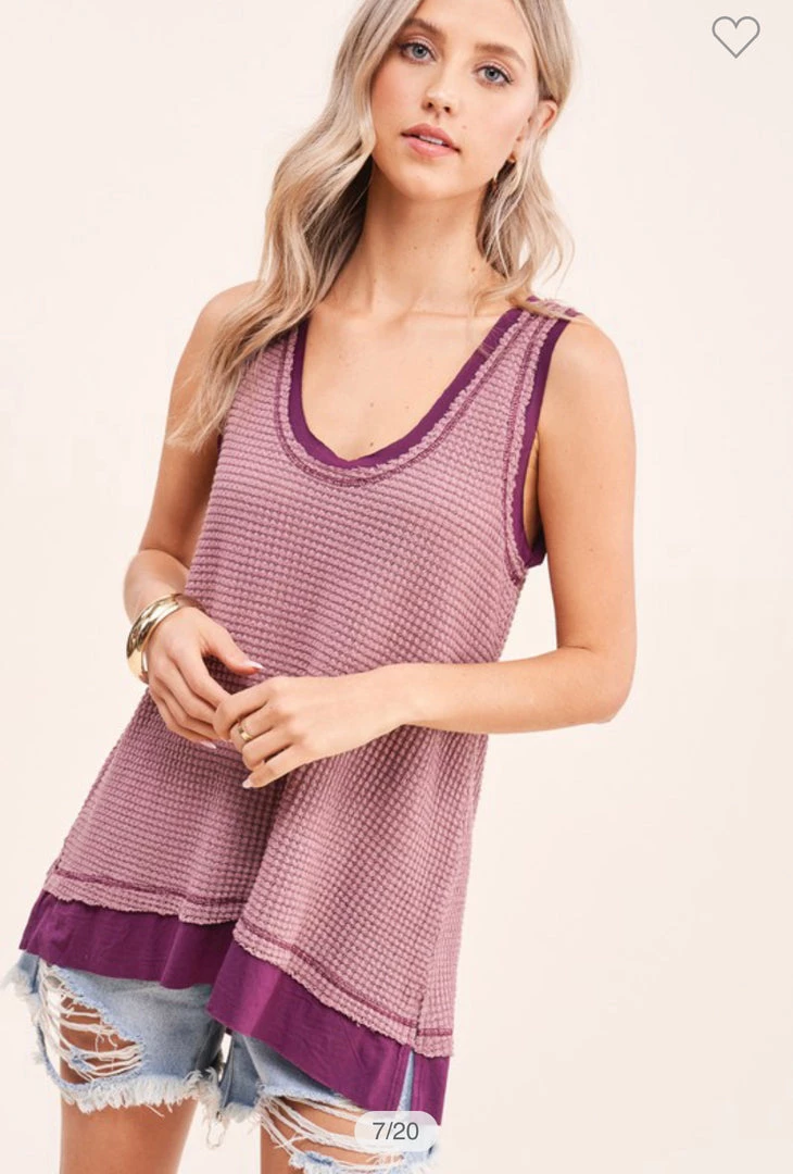 Scoop neck tank, waffle fabric, two-tone double layer that also works as an awesome layering piece.