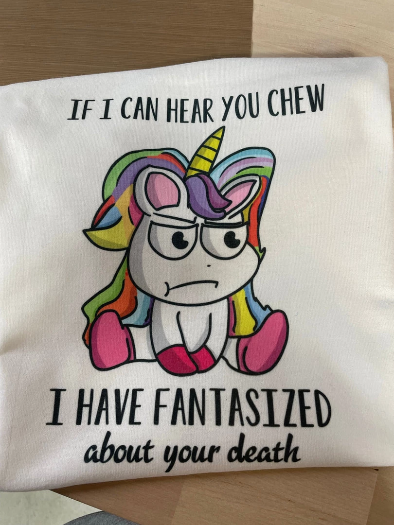 Custom printed angry unicorn if I can hear you chew t-shirt. Unicorn was drawn by my son.