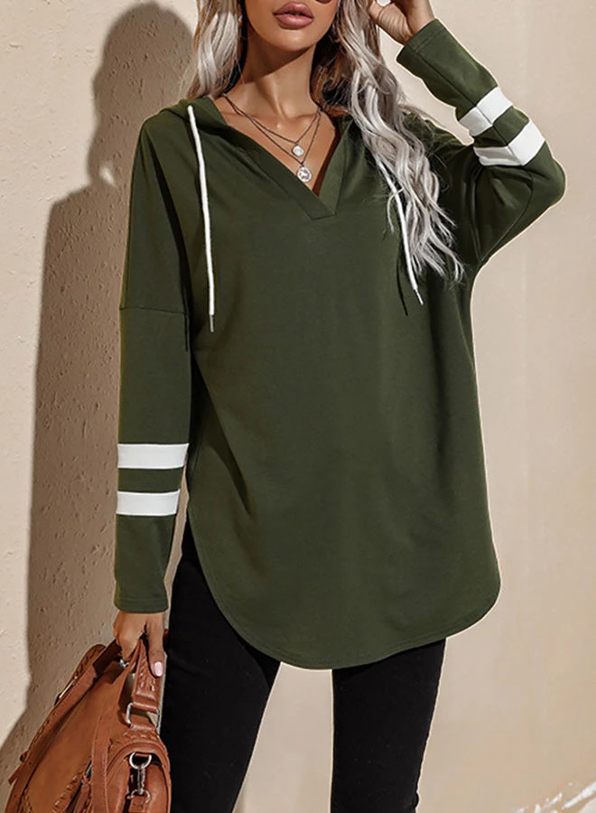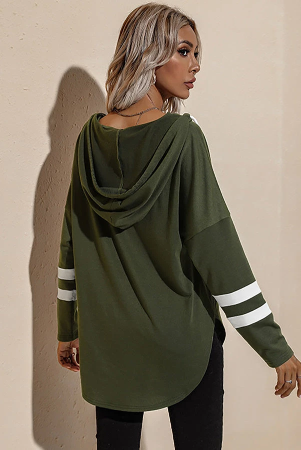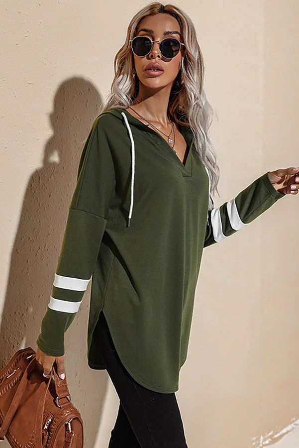Rounded hem v-neck tunic hoodie with a fun striped sleeve.