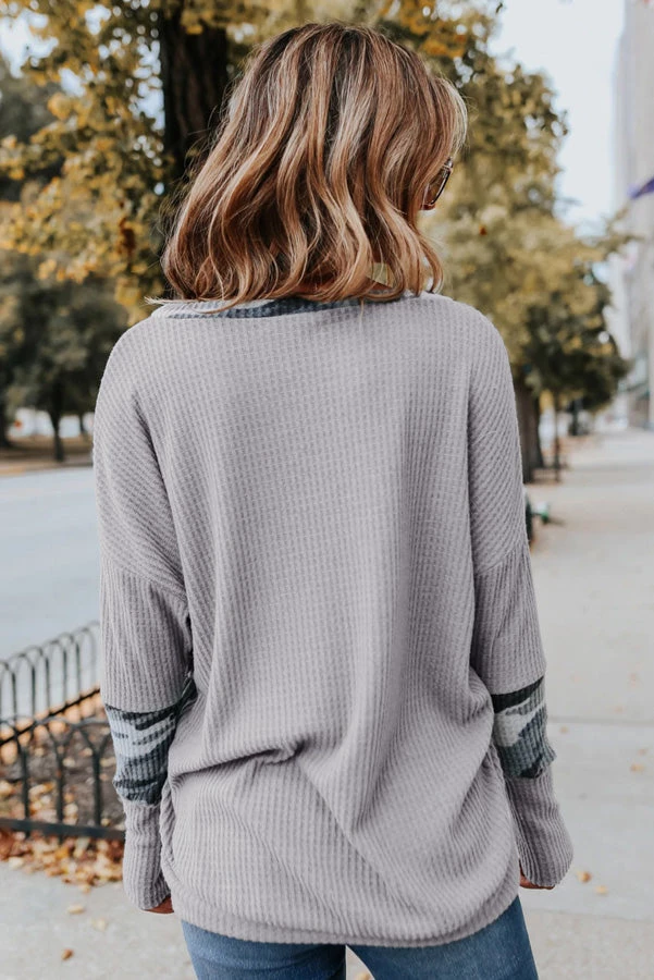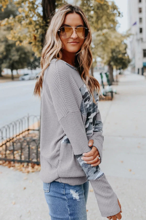 Ahhh such a cute top featuring a gray thermal camo print and a thumb hole.