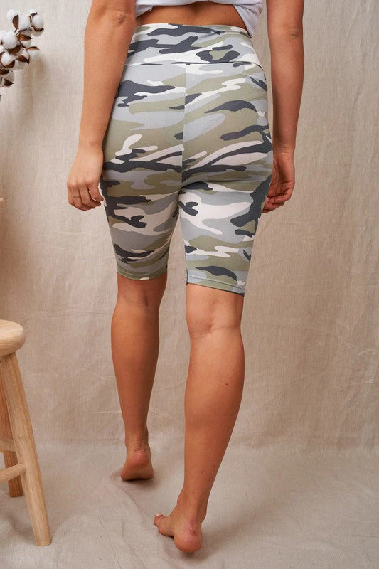High Waist Knit Camo Bike Shorts featuring a wide yoga waistband and a lightweight slinky material.